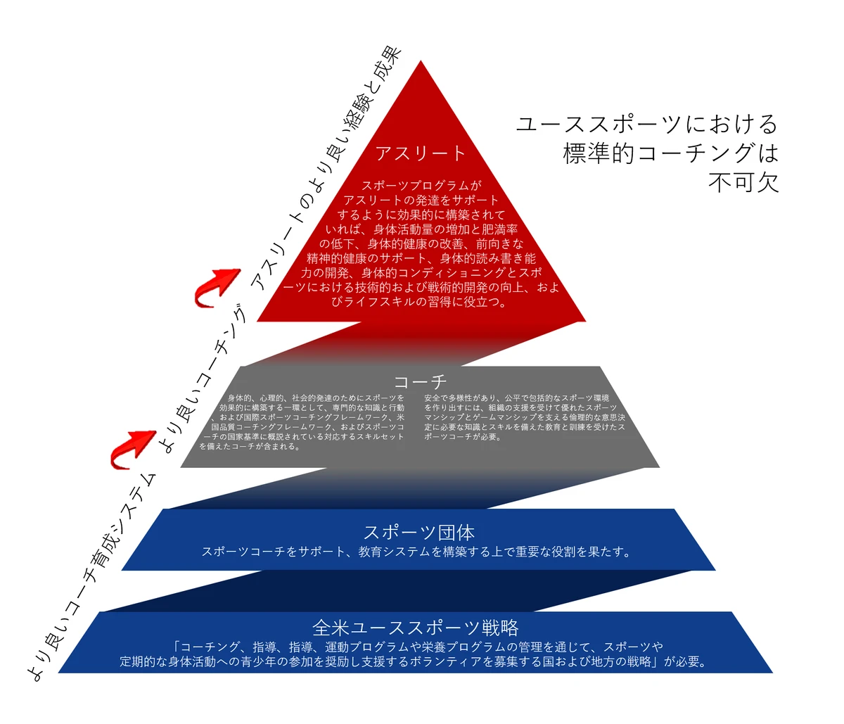 アメリカ合衆国(United States Center for Coaching Excellence): 幅広いスポーツプログラムが展開され、コーチング教育や資格制度が整備されている。また、技術的な面だけでなく、リーダーシップやコミュニケーションスキルなど、総合的なコーチング能力を重視する傾向がある。ユーススポーツにおける標準的コーチングを不可欠として、図1のような構造を示している。