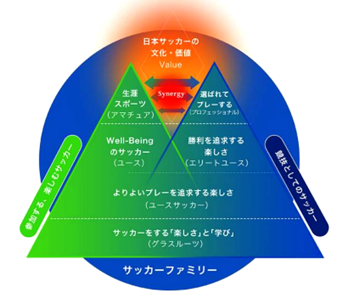 また、日本サッカー協会(2022)は2050年までに世界の頂点を目指す道筋としてJapan’s wayを発信した。先進国をプロファイルし、ナショナル・アイデンティティ、国内競争力、みんなのサッカーの浸透などの重要性を挙げた。双峰性のフットボールカルチャー創造図は、国際的な視野を持った構造的計画である。